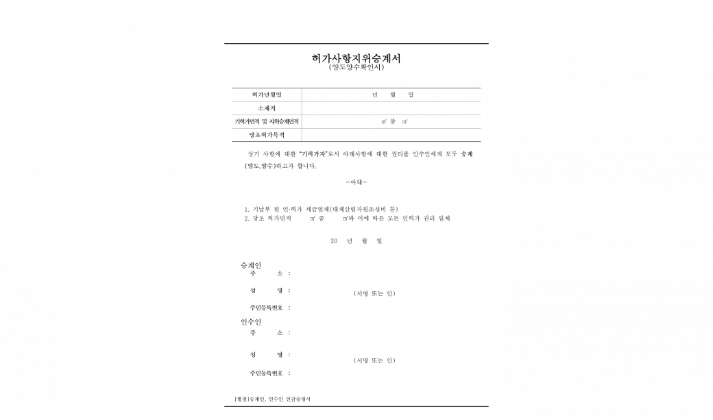 [구비서류 양식] 허가사항지위승계서(양도양수확인서) 2024-10-14 ㆍ 국성 조회 796 회 본문 한글(hwp)파일 다운로드 하실 수 있습니다. 첨부파일 허가사항지위승계서양도양수확인서.hwp (12.5K) 이전글국성 부동산 매니지먼트 -리플랫- 다음글[구비서류 양식] 토지이동신청서 및 위임장 목록보기